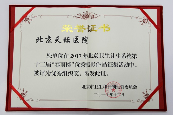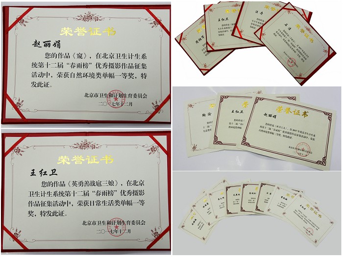 2017年12月13日,北京市卫计委召开北京卫生系统第十二届“春雨榜”优秀摄影作品颁奖典礼,我院共11人18幅作品分获一、二、三等奖及优秀奖,我院宣传中心荣获优秀组织奖。