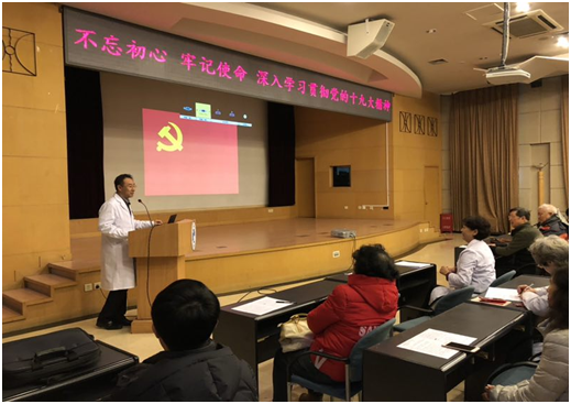 离退休党总支书记杨红宾向离退休党员传达了市委组织部、市老干部局《关于认真做好全市离退休干部学习宣传贯彻党的十九大精神工作的通知》;通报了2016年度市委组织部代管、市卫生计生委党委管理和市医院管理局党委管理党费收支情况;进行了北京市城乡居民基本医疗保险政策解读;带领离退休党员就党的十九大报告进行了《不忘初心,牢记使命,深入学习贯彻党的十九大精神》的学习。