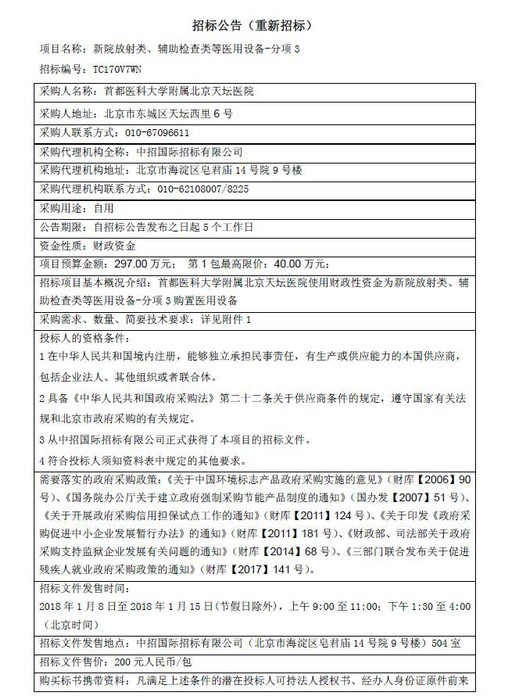 北京天坛医院新院放射类、辅助检查类等医用设备-分项3招标公告(重新招标)【编号:TC170V7WN】