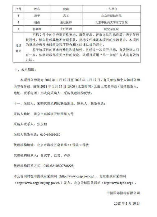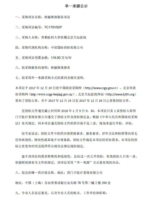 北京天坛医院核磁维保服务项目单一来源公示【编号:TC170V92P】