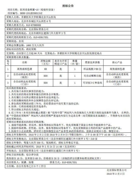 北京天坛医院医用设备购置-10(检验科设备)招标公告【编号:0686-1841B3560134Z】