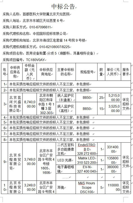北京天坛医院医用设备购置-分项5(麻醉科、耳鼻喉科设备)中标公告【编号:TC180V0AY】