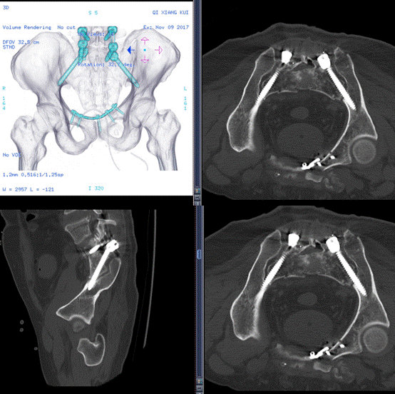 患者为一47岁男性,主因“高处坠落伤10小时”入院,诊断为骨盆骨折(S1S2骶骨骨折+左侧耻骨支坐骨支骨折),腰椎骨折(L4,L5)。入院后经过充分详细的术前准备, 并在医院医务处,医保办,综合采购部等部门的支持帮助下,11月08日联合手术室,麻醉科,术中电生理监测各团队配合下,由刘宝戈主任操刀,骨科宋磊副主任医师,韩伟峰,朱迪主治医师配合下成功实施L4L5S1椎弓根螺钉固定+S2AI骶骨翼-髂骨螺钉脊柱骶骨骨盆联合固定重建+前路左侧耻骨支骨折切开复位内固定术,术后患者恢复良好,对手术效果非常满意。