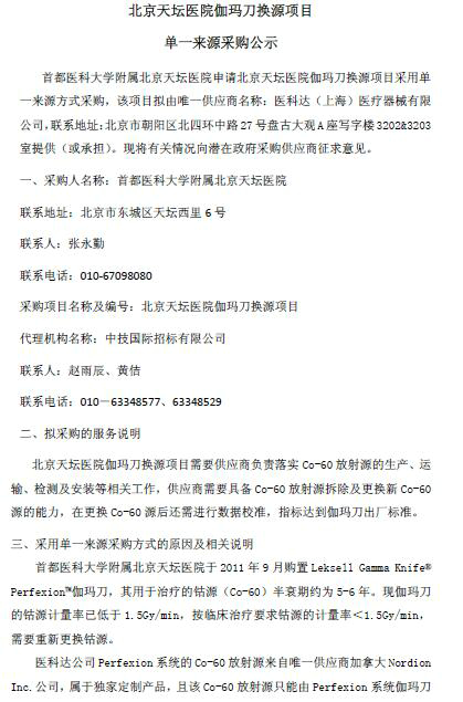 北京天坛医院伽玛刀换源项目单一来源采购公示