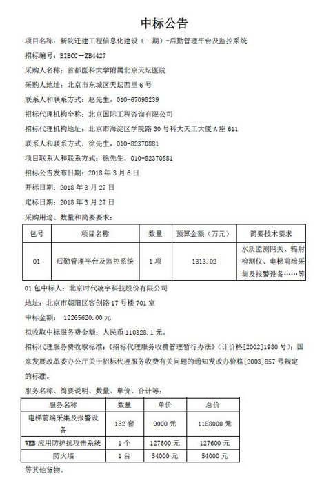 北京天坛医院新院迁建工程信息化建设(二期)-后勤管理平台及监控系统【编号:BIECC-ZB4427】