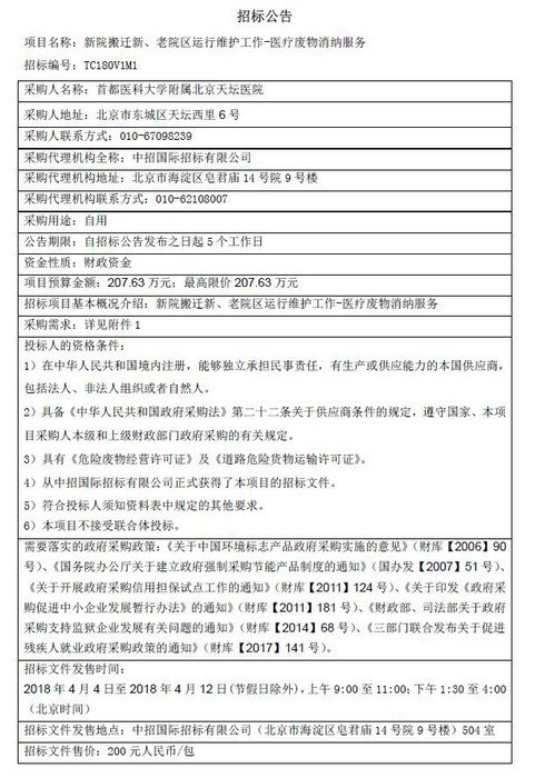 北京天坛医院新院搬迁新、老院区运行维护工作-医疗废物消纳服务