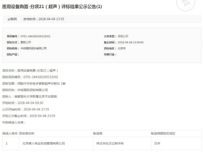 北京天坛医院医用设备购置-分项21(超声)评标结果公示公告