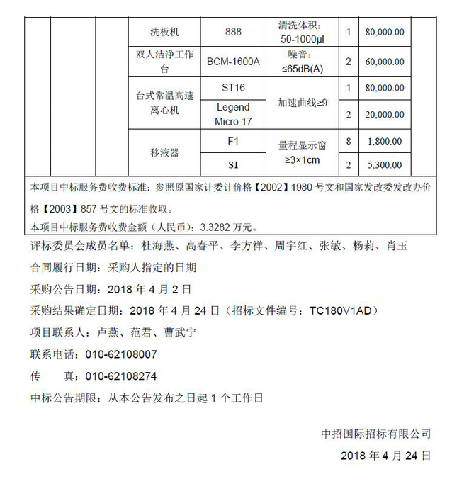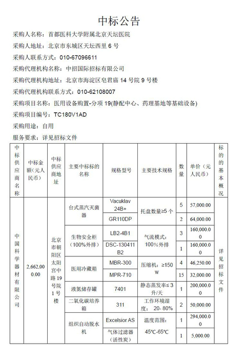 北京天坛医院医用设备购置-分项19(静配中心、药理基地等基础设备)中标公告
