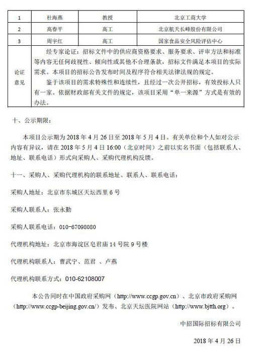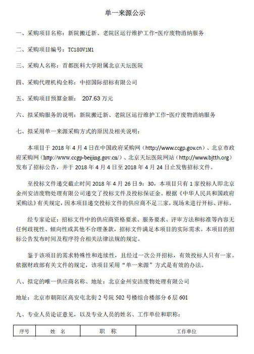 北京天坛医院新院搬迁新、老院区运行维护工作-医疗废物消纳服务单一来源公示