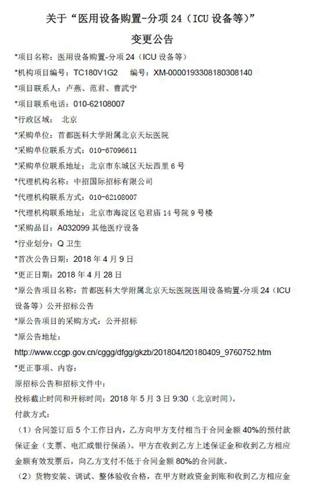 北京天坛医院关于“医用设备购置-分项24(ICU 设备等)”变更公告
