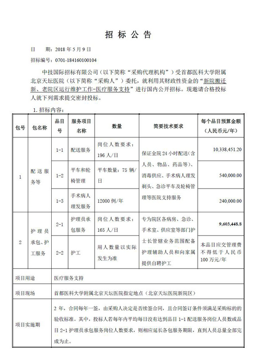 北京天坛医院新院搬迁新、老院区运行维护工作-医疗服务支持招标公告