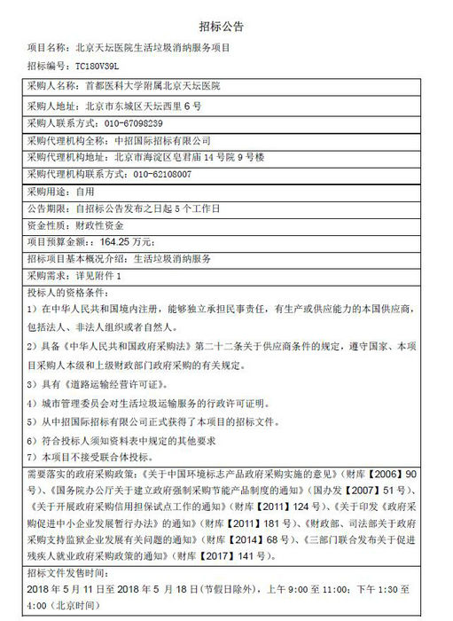 北京天坛医院生活垃圾消纳服务项目招标公告