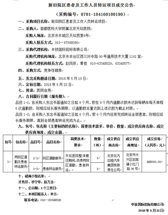 北京天坛医院新旧院区患者及工作人员转运项目成交公告