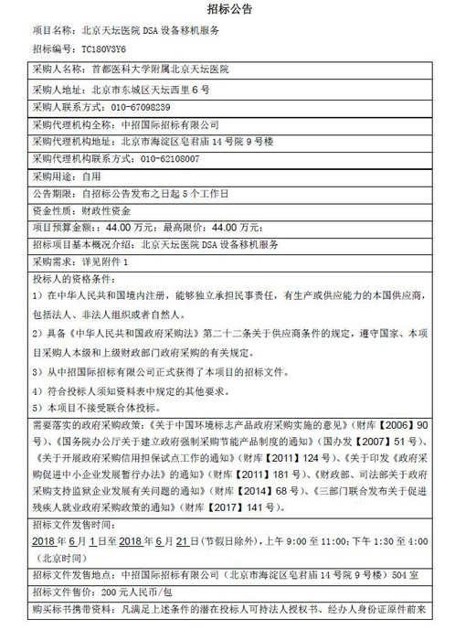 北京天坛医院 DSA 设备移机服务招标公告