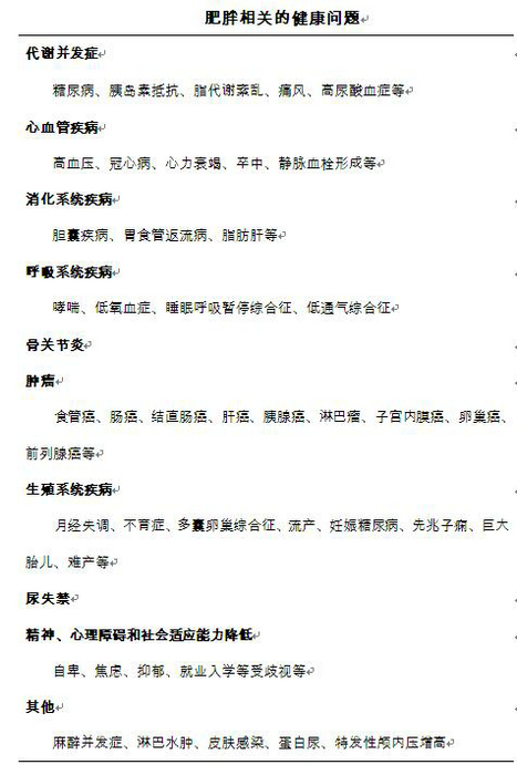 肥胖可以导致一系列并发症或者相关疾病,进而影响预期寿命或者导致生活质量下降。严重的肥胖患者心血管疾病、糖尿病及某些肿瘤的发生率及死亡率也明显上升。有研究表明,肥胖者患高血压的危险是体重正常者的3~4倍,患者糖尿病的危险是正常人的2~3倍,患高脂血症的危险是正常人的3~4倍。
