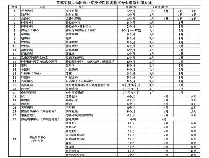 首都医科大学附属北京天坛医院各科室专业进修时间安排