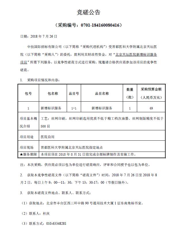 北京天坛医院新增标识服务项目竞磋公告