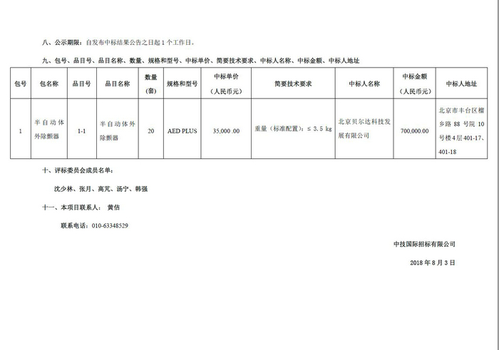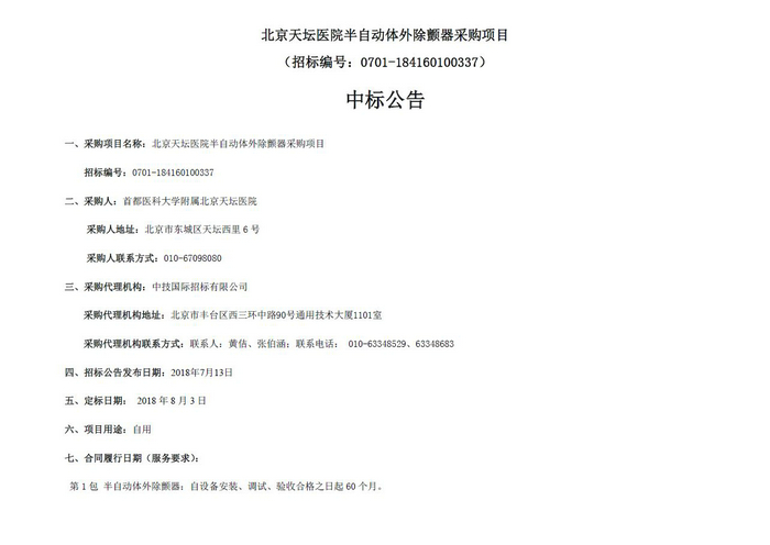 北京天坛医院半自动体外除颤器采购项目(招标编号:0701-184160100337)中标公告