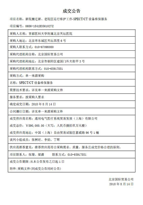 北京天坛医院新院搬迁新、老院区运行维护工作-SPECT/CT 设备维保服务成交公告