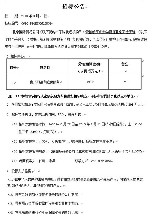 北京天坛医院新院搬迁新、老院区运行维护工作-伽玛刀设备维保服务招标公告