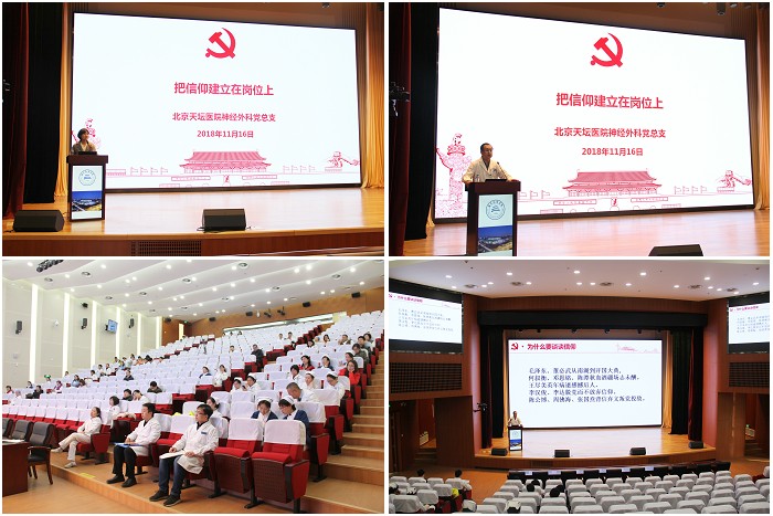 根据北京天坛医院年度教育计划安排,2018年11月28日,北京天坛医院党委委员、神经外科党总支书记、神经外科副主任贾旺在忠诚楼阶梯教室讲授题为《把信仰建立在岗位上》的主题党课。医院党委委员,各支部党员代表、统一战线代表人士及第27期入党积极分子培训班全体学员100多人参加了辅导。
